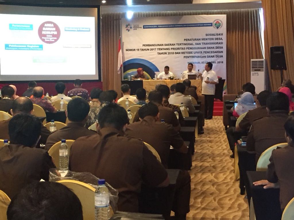 Kementerian Desa, Pembangunan Daerah Tertinggal, dan Transmigrasi (Kemendes PDTT) menggelar Sosialisasi Peraturan Menteri Desa, Pembangunan Daerah Tertinggal, dan Transmigrasi (Permendesa PDTT) Nomor 19 Tahun 2017 tentang Prioritas Penggunaan Dana Desa Tahun 2018 dan Metode Pencegahan Penyimpangan Dana Desa kepada para pemangku kepentingan desa di Mataram, Nusa Tenggara Barat (NTB), Jumat (27/4). Hal tersebut ditujukan untuk meningkatkan pemahaman para jaksa dan kepala desa mengenai peruntukan prioritas penggunaan dana desa agar tidak terjadi penyimpangan.